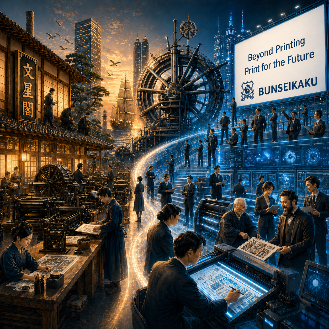 旧時代の“楽園”となった印刷業界から、 文星閣は、情報産業という大海原へ出航します。 500年かけて築かれた印刷文化を武器に、 仕組みを変え、仲間を集め、業界を超えて価値を届ける。 誰かが決めたルールに従うのではなく、 自分たちの手で働き方と組織をつくり直す。 そして── 夢を分かち合い、自由を謡いながら、印刷の未来を創る。 それが、私たち文星閣のこれからの姿です。