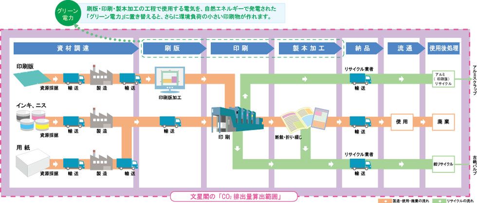 用紙、インキ、印刷版など原材料の製造から、印刷、製本・加工、使用後の廃棄、そしてリサイクルに至るまで。文星閣のカーボン・オフセットは、ライフサイクルアセスメント(Life Cycle Assessment, LCA)による環境影響評価をもとに、印刷物が「一生」にわたって排出するCO₂の量をPGG*により算定し、これを相殺します。