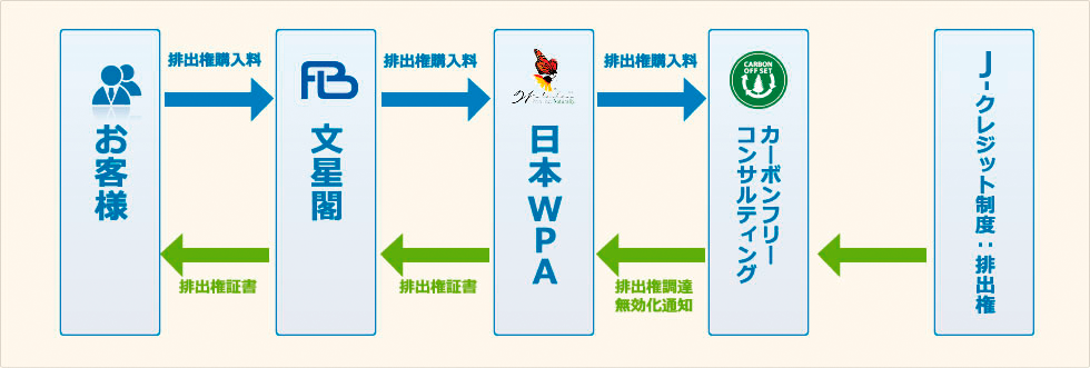 原材料を見直し、製造工程を改善しても、印刷物製造に伴うCO₂をゼロにすることはできません。それでも排出されてしまうCO₂は、ほかで行われたCO₂排出削減事業などで生じた排出権を購入し、相殺(カーボン・オフセット)することができます。文星閣のカーボン・オフセットでは、「一般社団法人日本WPA(日本水なし印刷協会)がカーボン・オフセットプロバイダー「カーボンフリーコンサルティング株式会社」を通して購入する排出権を使います。これは国が認証するJ-クレジット制度(国内排出削減量認証制度)による排出権となります。