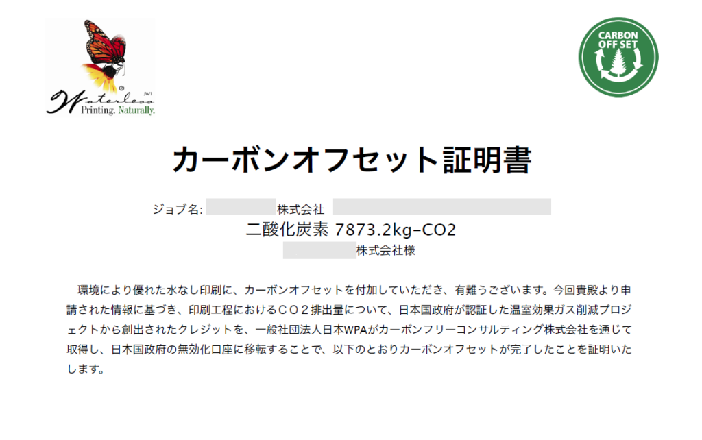 当社では、環境にやさしい水なし印刷をベースに、印刷の原材料調達から工場での製造、輸送・破棄・リサイクルで発生するCO₂量を算定し、カーボン・オフセットできるサービスを提供しています。