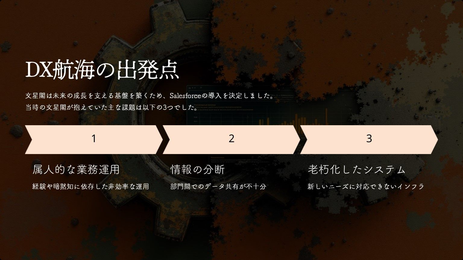 これらの課題を解決し未来の成長基盤を築くために、私たちは「Salesforce」を選んだのです。