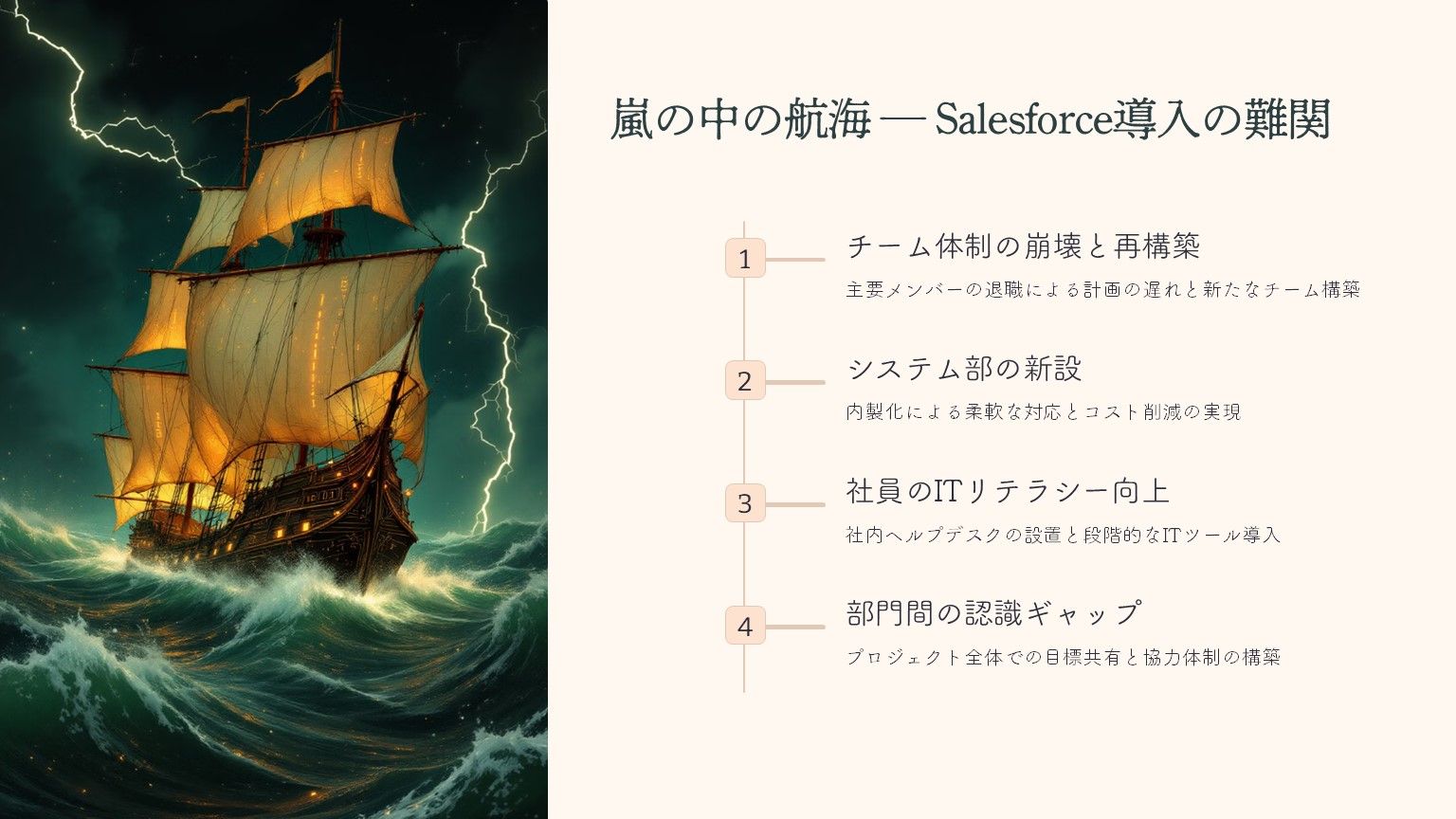 その中で私たちは、未来を切り拓くための航海に出る決意をしました。その航海の羅針盤となったのが、Salesforceを活用した基幹システムの再構築です。