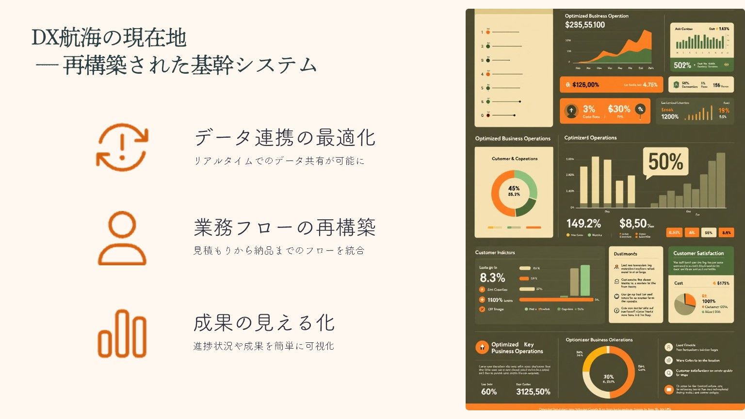 4. 部門間の認識ギャップ:当初はDXに対する期待や理解が各部署で異なっていました。改めてプロジェクト全体の目標共有の場を設け、各部門が協力しやすい環境を整えました。