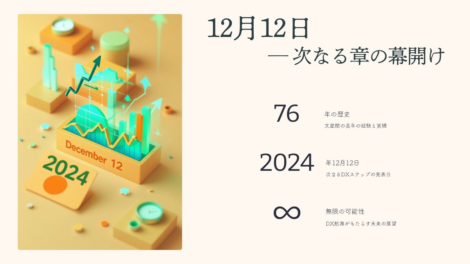 2024年12月12日、文星閣はDX航海の次なるステップを発表します。この日を迎えるにあたり、これまでの成果を振り返り、さらなる未来への期待を高めています。
