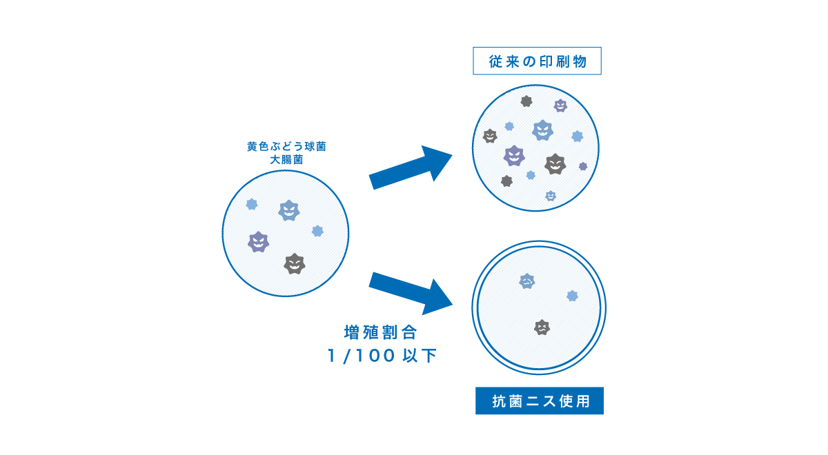 抗菌効果のある銀イオン配合ニスを印刷物の表面にコーティングすることで、抗菌効果を持たせる印刷方式です。印刷物の表面の細菌増殖を抑制し、清潔な状態を保ちます。