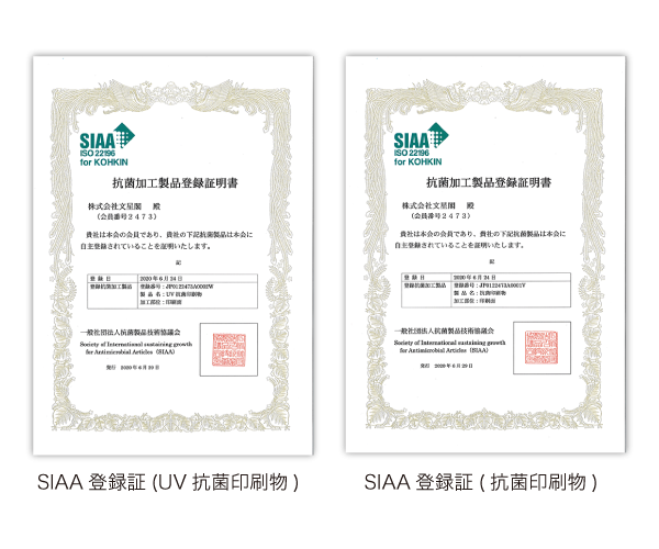 抗菌製品技術協議会(SIAA)が制定した抗菌のシンボルマークです。次の3つの基準を満たした製品に、SIAAマークが表示されます。SIAA会員である文星閣の印刷物には、SIAA(抗菌加工)マークの表示が可能です。