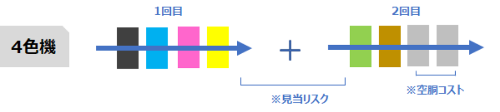 5色や6色仕様の印刷物を4色機で印刷する場合、用紙を2回通すことになりますが、その為に再度セッティングが必要になり全体の印刷時間が延びます。また空胴分(印刷をしない胴)のコストも余計に発生してしまう為、「コストパフォーマンスが悪い仕様」とされてしまうケースがあります。5色機や6色機であればワンパスで刷り終えることが可能になるため、コストパフォーマンスも上がり、見当性など品質面でのリスクも回避することができます。