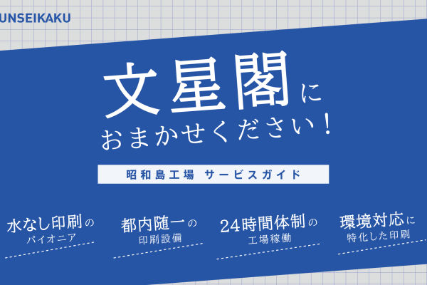 Direction(ダイレクション) 工場見学 環境対応 DX航海日誌 キャンペーン DX/ITシステム 資料DL 中途採用 新卒採用 セキュリティ 年男・年女 ハピネスアワー HISTORY(文星閣の歴史) 短納期 コミュニケーション Solution(ソリューション) 品質/生産管理 PEOPLE 印刷機/CTP設備 水なし印刷 社員紹介 文星閣イベント開催 特殊印刷 LIMEX 商品 印刷学 プリナビ YOUは何しに文星閣へ ナレッジマネジメント カーボンオフセット文星閣 公式X(旧Twitter)アカウント