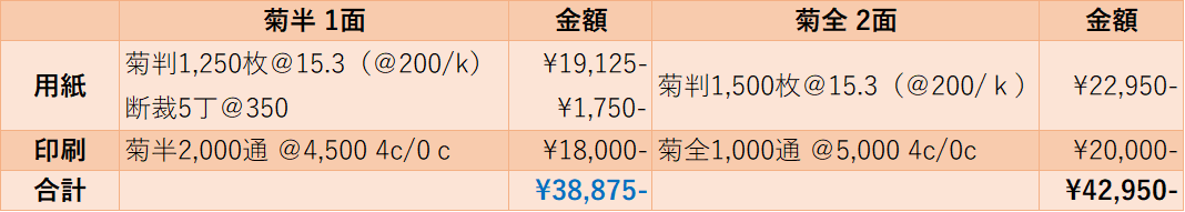 この案件を見積もるなら、菊全2面付か菊半1面付かで悩むところです。 実際に比較してみましょう。
