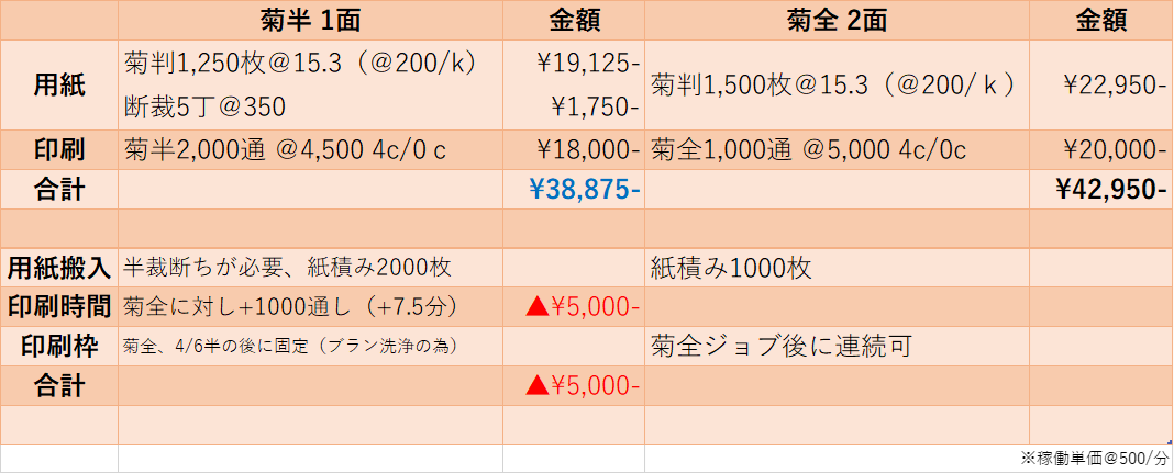 このように通常通り見積もると、用紙の使用数が減らせることから菊半1面付の方が安い価格を提示出来る?と思えます。