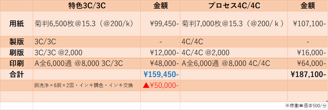 単純に単価だけで比較をすれば、4c/4cと比べると低くなります。しかし3c/3cでは見当合わせが早く済みやすくなるなど、時間的なメリットがあります。